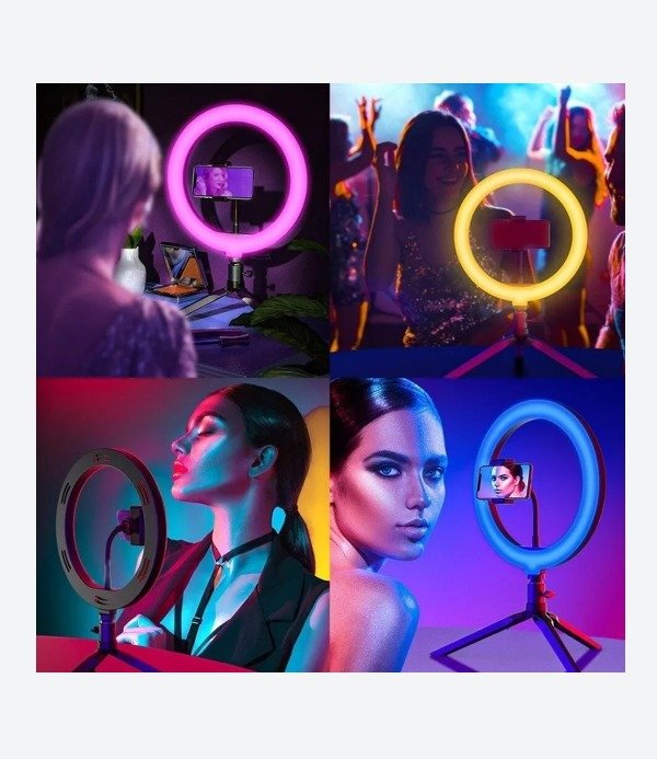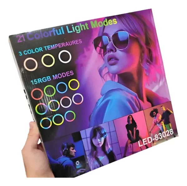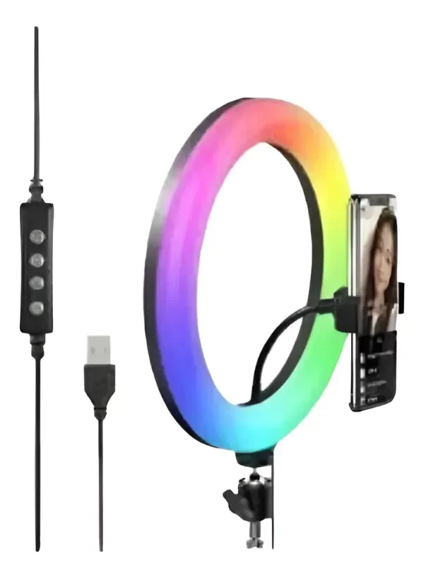 Anillo de luz led RGB regulable. Cuenta con la opción de iluminar en distintos colores además del clásico frio, neutro o cálido. Vas a poder darle el toque distinto a tus videos, streaming, fotos, etc.