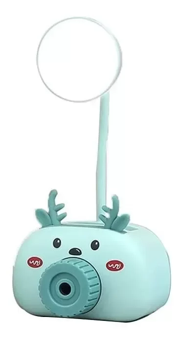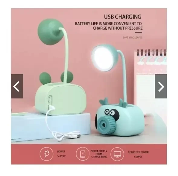 Lámpara LED con forma de animal, en la que la nariz es un sacapuntas con una caja de depósito y un portalápices en la parte superior. Ideal para decorar la zona de trabajo. Viene con un cable USB.
