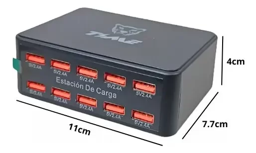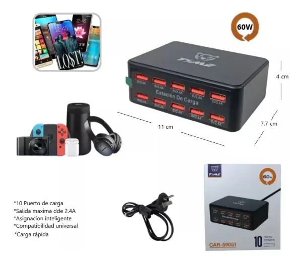 La Estación de Carga USB 10 Puertos 60W es la solución perfecta para mantener todos tus dispositivos electrónicos cargados de manera rápida y eficiente. Con 10 puertos USB-A que permiten cargar hasta 10 dispositivos simultáneamente, este cargador es ideal para hogares, oficinas, o cualquier lugar donde sea necesario cargar varios dispositivos al mismo tiempo. Su potente salida total de 60W garantiza una carga rápida y segura para smartphones, tabletas, auriculares, consolas de juegos, cámaras y más. Equipado con un sistema de protección contra sobrecargas y cortocircuitos, garantiza la seguridad de tus dispositivos mientras se cargan.